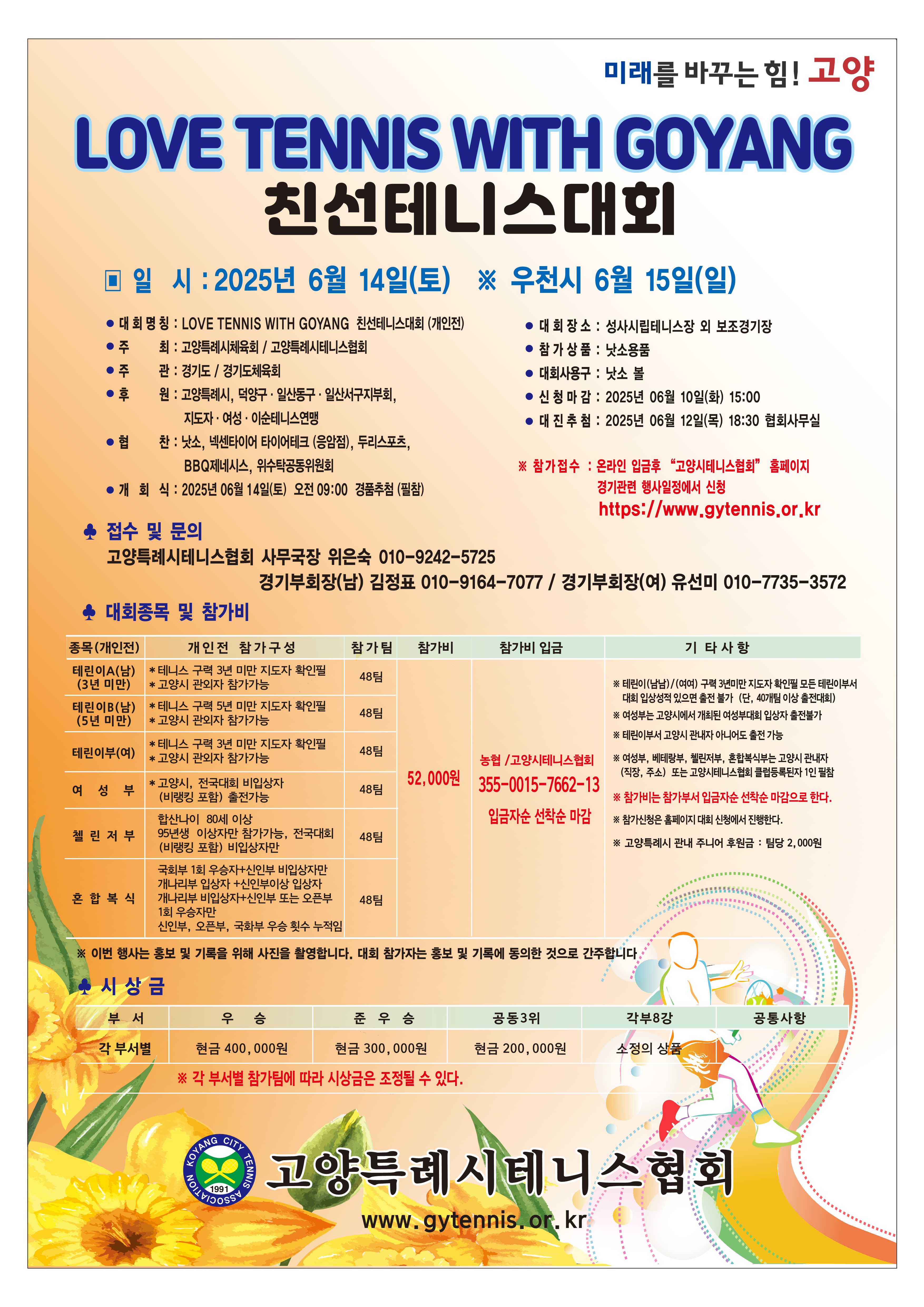 LOVE TENNIS WITH GOYANG 친선테니스대회 요강 및 세부사항은 첨부파일 참고바랍니다.