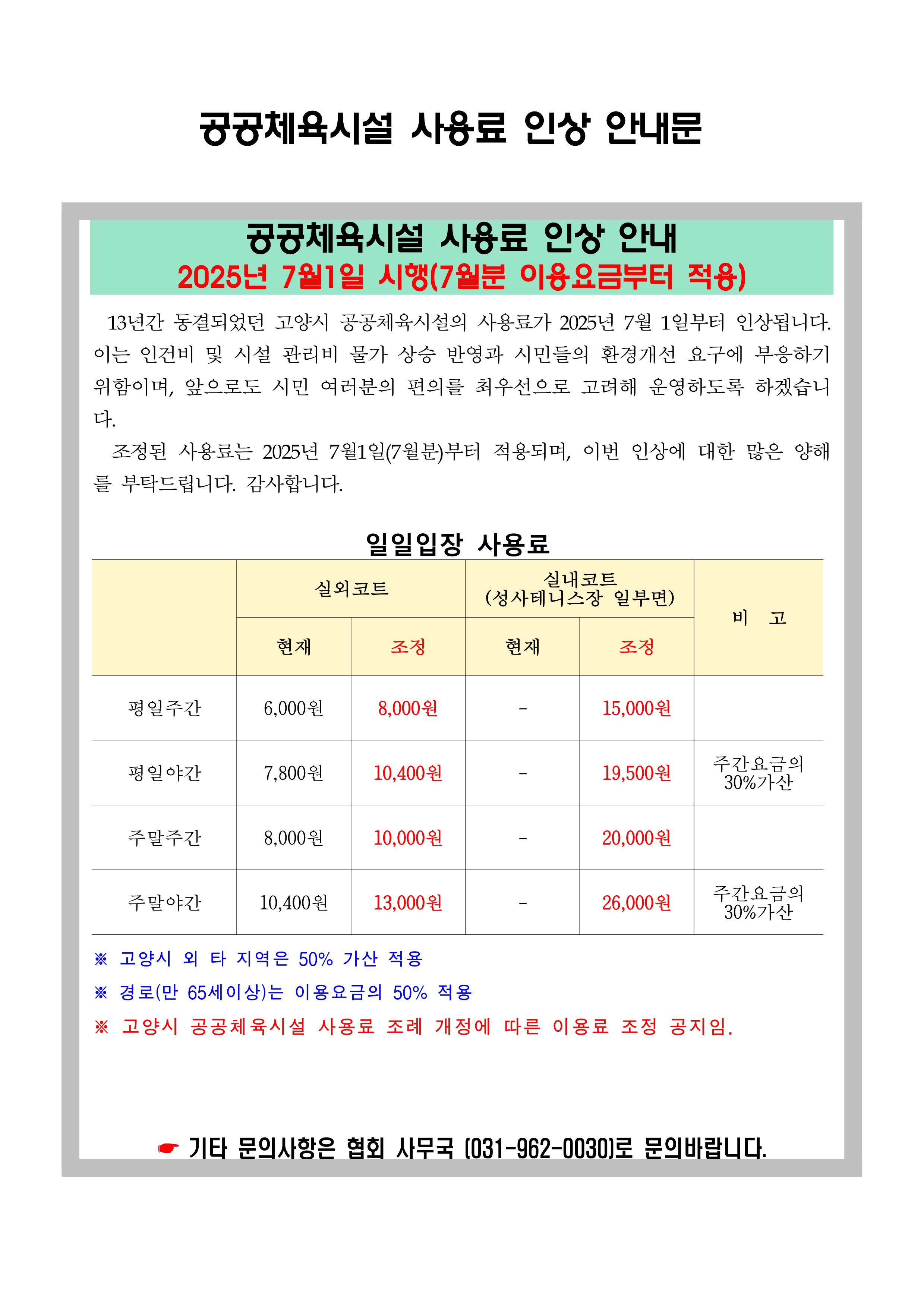 공공체육시설 사용료 인상 안내문(25년 7월분 이용요금부터 적용)