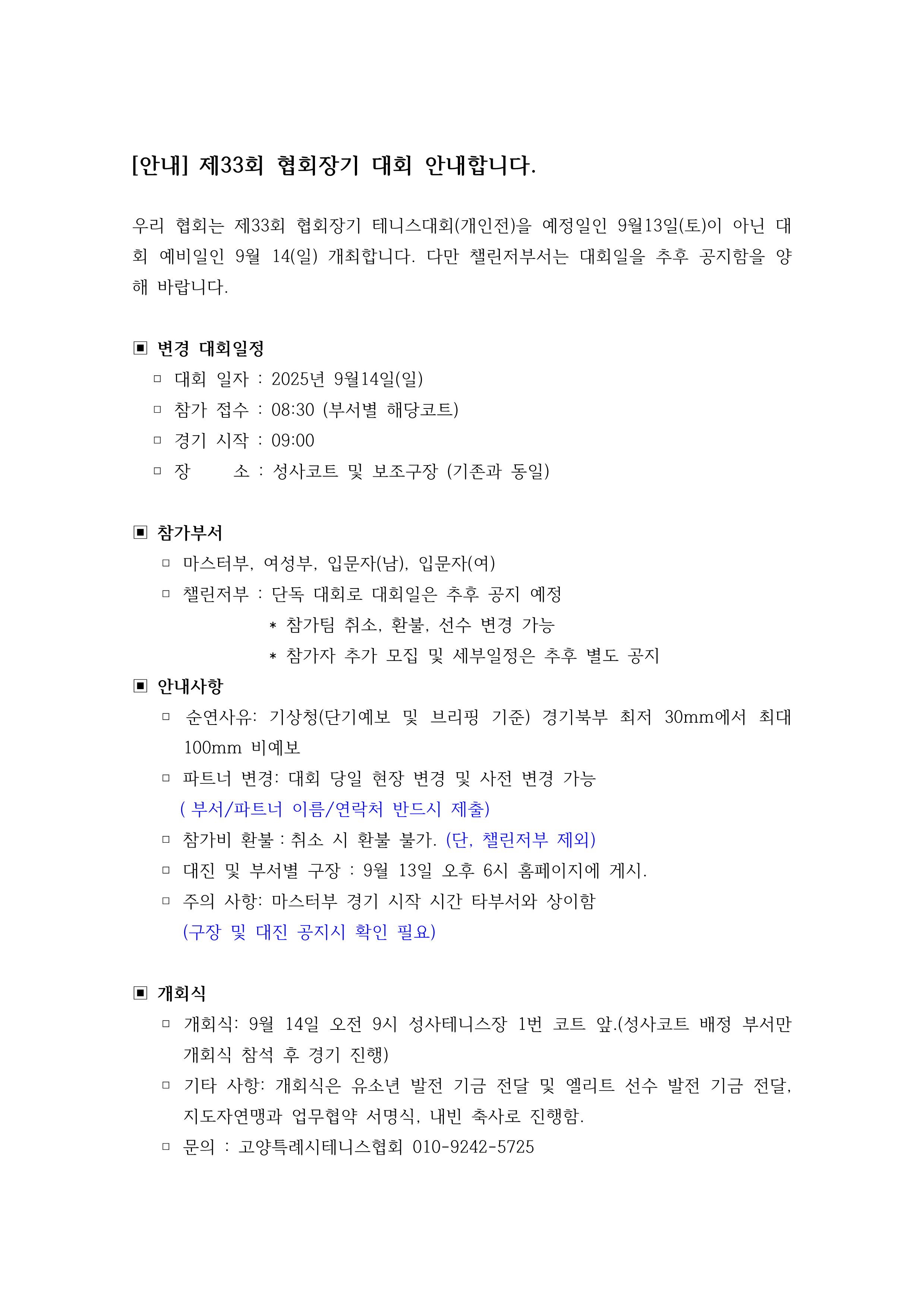 [안내] 제33회 협회장기 테니스대회 일정 안내합니다.