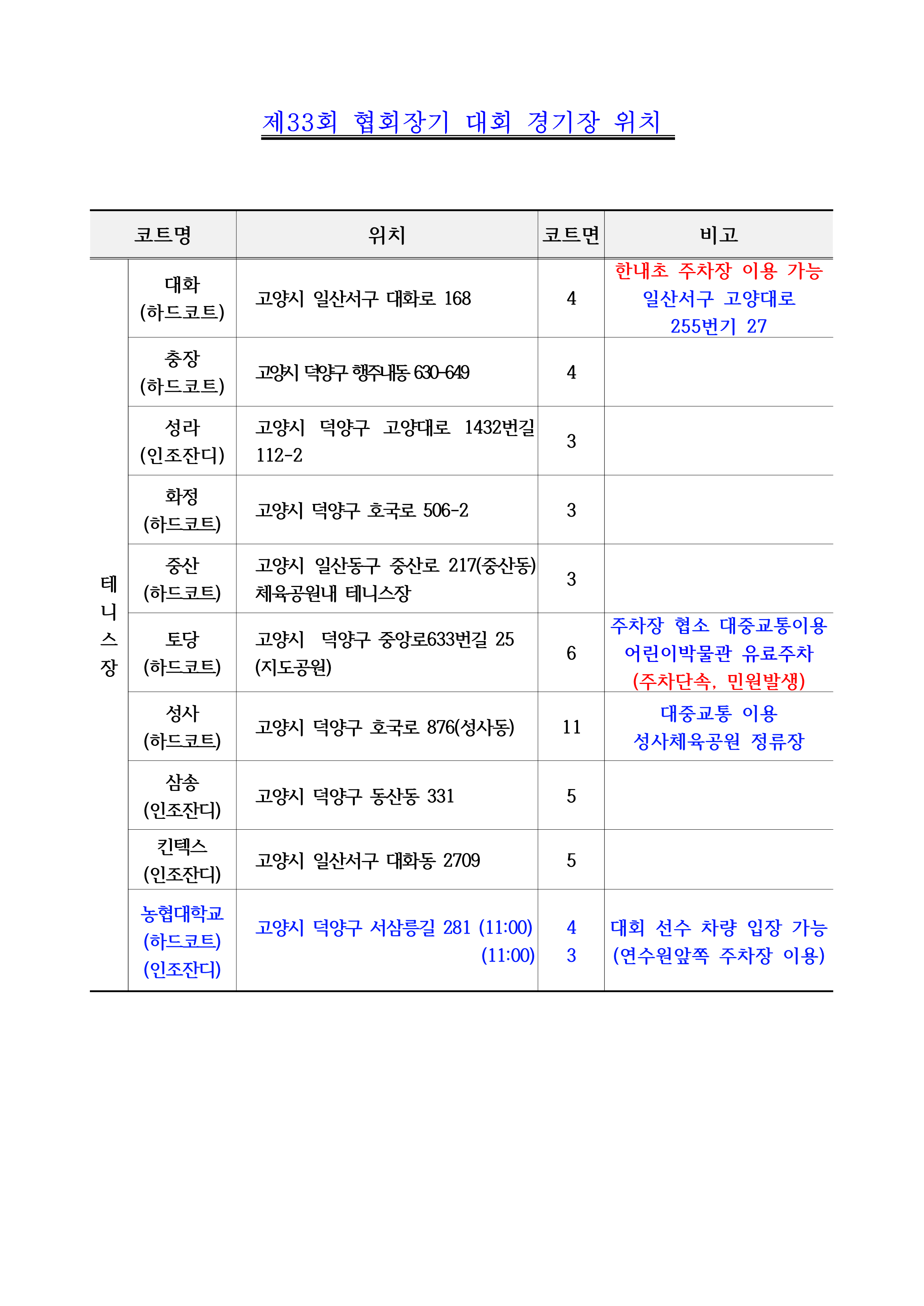 [안내]제33회 협회장기 테니스대회 경기장 위치