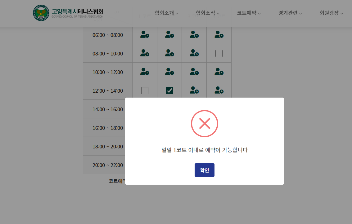 관내시민 인증했는데도 예약 버튼 안떠요. 다른 시간을 선택하면 아래 팝업이 뜹니다.