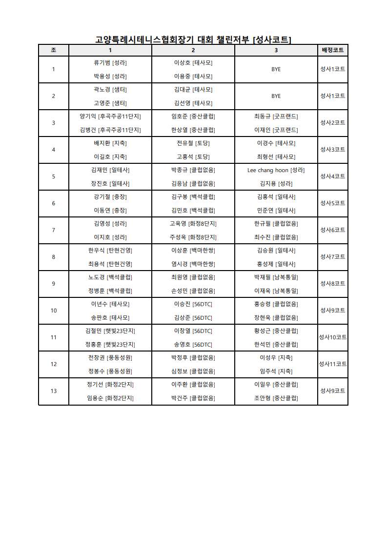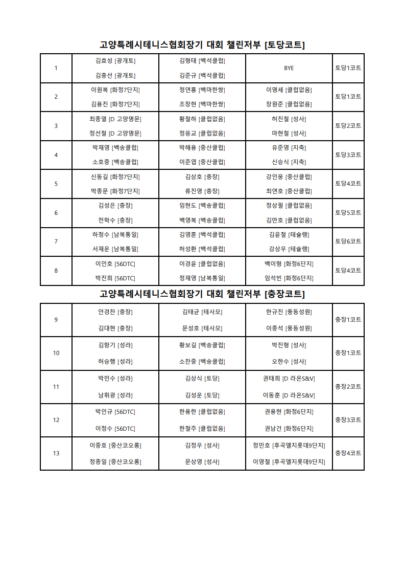 [경개 대진 안내] 11/8(토) 협회장기 챌린저부 대진표 안내